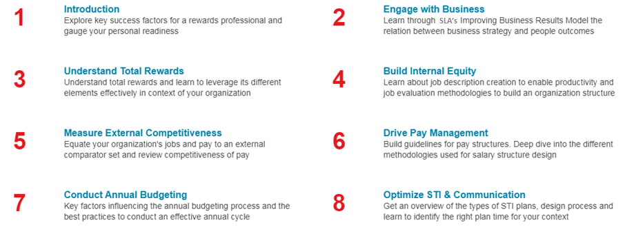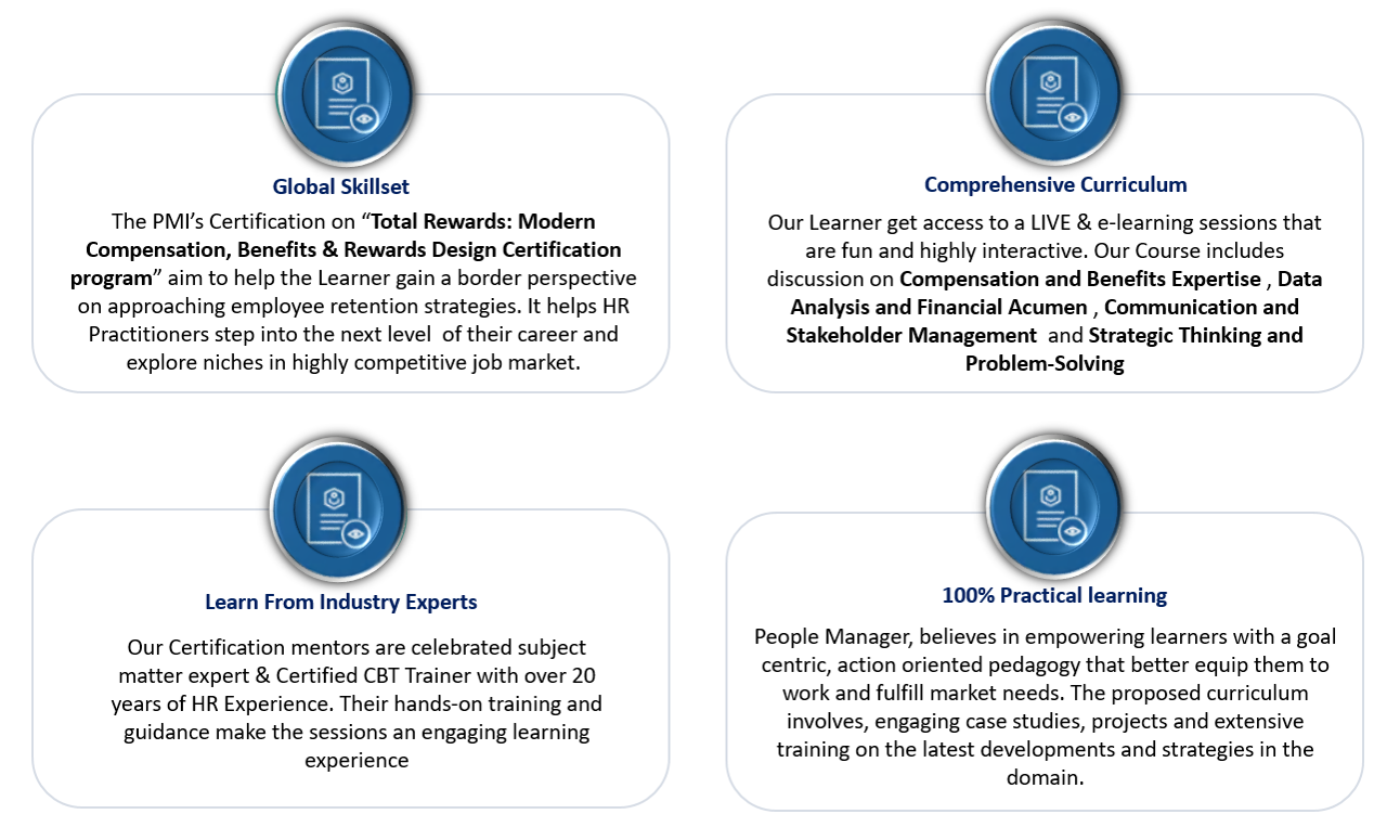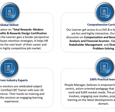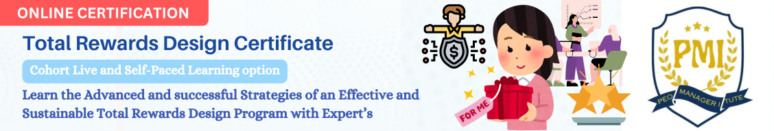 The Total Rewards Certification Program is an updated online program designed to equip HR professionals with advanced strategies to attract, motivate, and retain employees through comprehensive reward systems ....Job Grading | Incentive Design | ESOP | Salary Structure | Radford | Pay Equity | Bonus Plan | Health & Wellness Benefits | Retirement Plans | Insurance Coverage | Paid Time off (PTO) | Education Assistance | Remote Work Benefits | Wellness & Mental Health Support | Recognition Programs | Career Development | Work-Life Balance Initiatives | Cultural & Social Perks