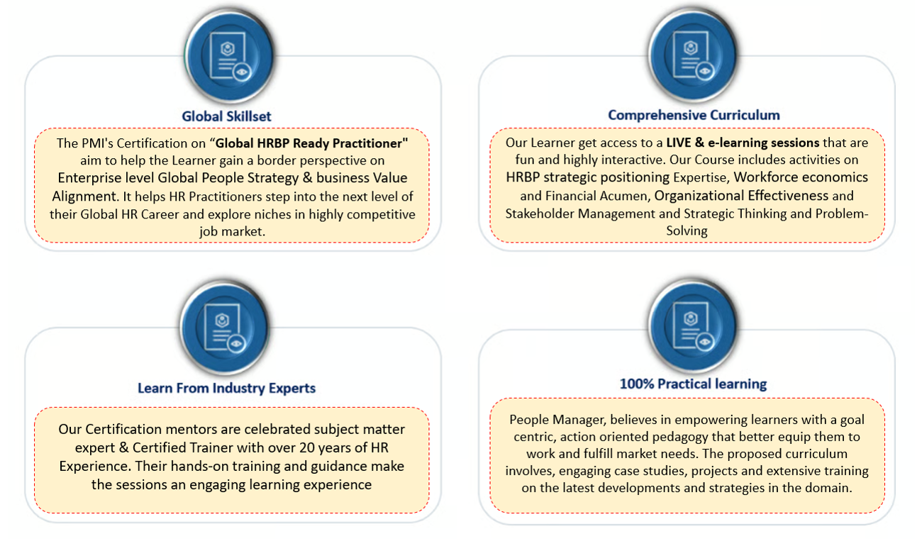 The PMI's HRBP Ready Practitioner/Professional Certificate provides a holistic and Organizational Objective-centric view of the HRBP landscape, addressing both fundamentals and emerging HR- Business & People Partnering trends. What you will learn?