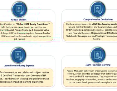 The Strategic HRBP Certification Program is an Comprehensive online program designed to equip HR professionals with advanced strategies to attract, motivate, and retain employees through comprehensive reward systems ....Job Grading | Incentive Design | ESOP | Salary Structure | Radford | Pay Equity | Bonus Plan | Health & Wellness Benefits | Retirement Plans | Insurance Coverage | Paid Time off (PTO) | Education Assistance | Remote Work Benefits | Wellness & Mental Health Support | Recognition Programs | Career Development | Work-Life Balance Initiatives | Cultural & Social Perks