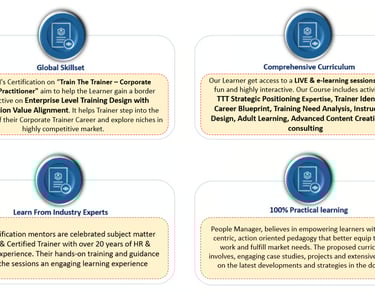 The TTT Certification Program is a comprehensive professional certificate designed to equip corporate trainers, HR professionals, and L&D leaders with advanced skills to design, deliver, and scale enterprise learning ecosystems aligned with business outcomes. This six-module curriculum blends strategy, instructional design, digital enablement, facilitation mastery, learner engagement, and ROI-driven training operations to transform trainers into strategic partners of organizational growth… Training Needs Analysis | Competency Mapping | Business Alignment | ADDIE Curriculum Design | Instructional Design | Content Development | Experiential Learning | Storytelling | Microlearning | Digital Learning | LMS Platforms | Virtual Facilitation | Facilitation Excellence | Communication Mastery | Group Dynamics | Learner Engagement | Coaching & Mentoring | Capability Development | Assessment & ROI | Kirkpatrick Model | Training Analytics | Governance | Training Business Strategy